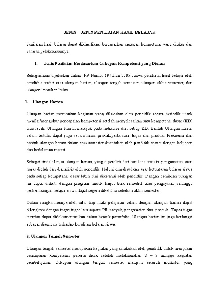 19 tahun 2005 tetang standar nasional pendidikan dan permendiknas no. Survei dengan wawancara kelompok 5. Jenis penilaian berbentuk tes merupakan semua jenis penilaian yang hasilnya dapat dikategorikan menjadi benar dan salah, misalnya jenis penilaian untuk mengungkap aspek kognitif dan psikomotorik. Selain penilaian di atas, ada beberapa jenis penilaian antara lain: 20 tahun 2007 tentang standar.